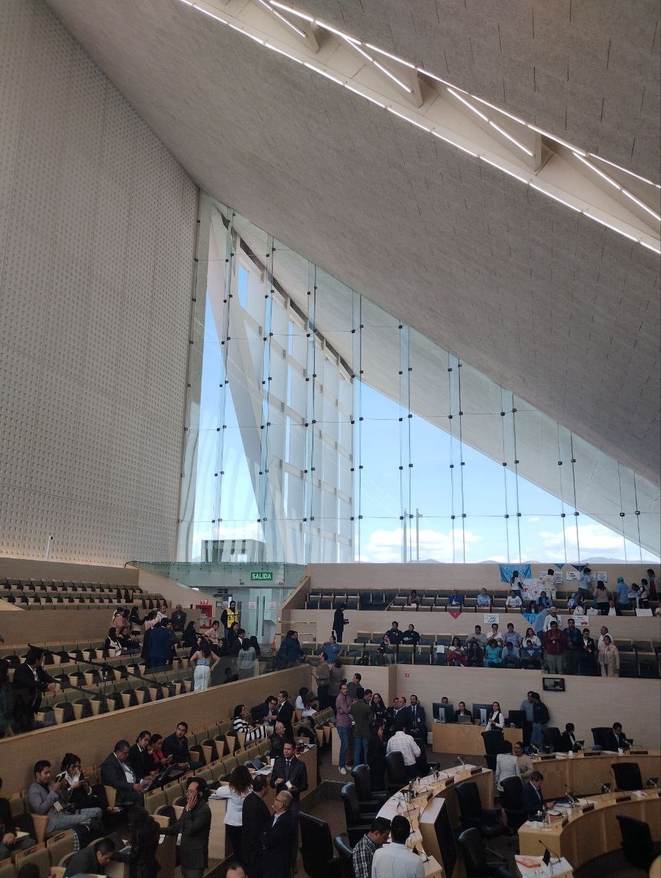 El muro principal del edificio que aloja al poder legislativo está completamente cubierta de paneles de vidrio, lo que permite que la luz natural ilumine la sala del pleno, pero se ha convertido en un problema logístico porque no es la primera vez que uno de estos paneles se suelta, lo cual representa un riesgo de protección civil y un gasto para las arcas del Congreso.