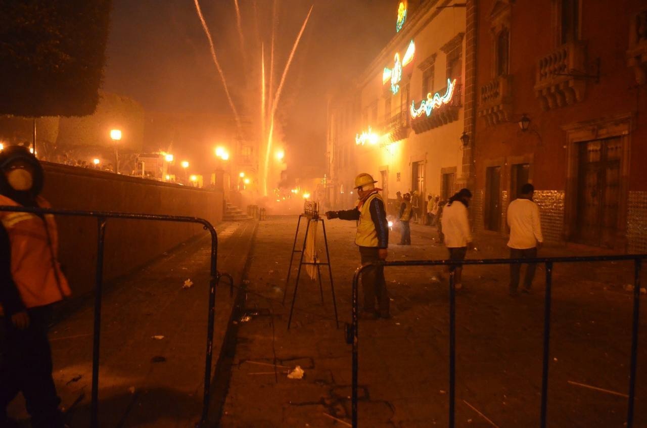 En punto de las 4 de la mañana, las luces del Jardín Principal se apagan y comienza la quema de la “cuetiza”, que incluye truenos, pajareros, bombas, cajas, chorizos y un castillo que arden desde el Palacio Municipal y el atrio de la parroquia por más de una hora de manera ininterrumpida. Los asistentes se resguardan en los árboles del jardín o disfrutan del espectáculo, mientras los más osados bailan frente a la parroquia esquivando los proyectiles de pirotecnia.