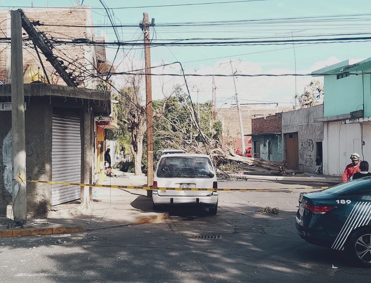 La caída del árbol ocasionó que los cables de luz que se encontraban en la calle dañaran la estructura del poste de luz haciendo que se partiera en la parte superior.