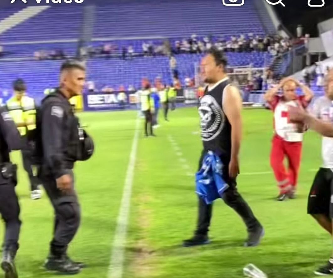 Los enardecidos aficionados siguieron hasta medio campo al guardia, quien en su huida cayó al césped, lo aprovecharon los pseudo aficionados para patearlo.
