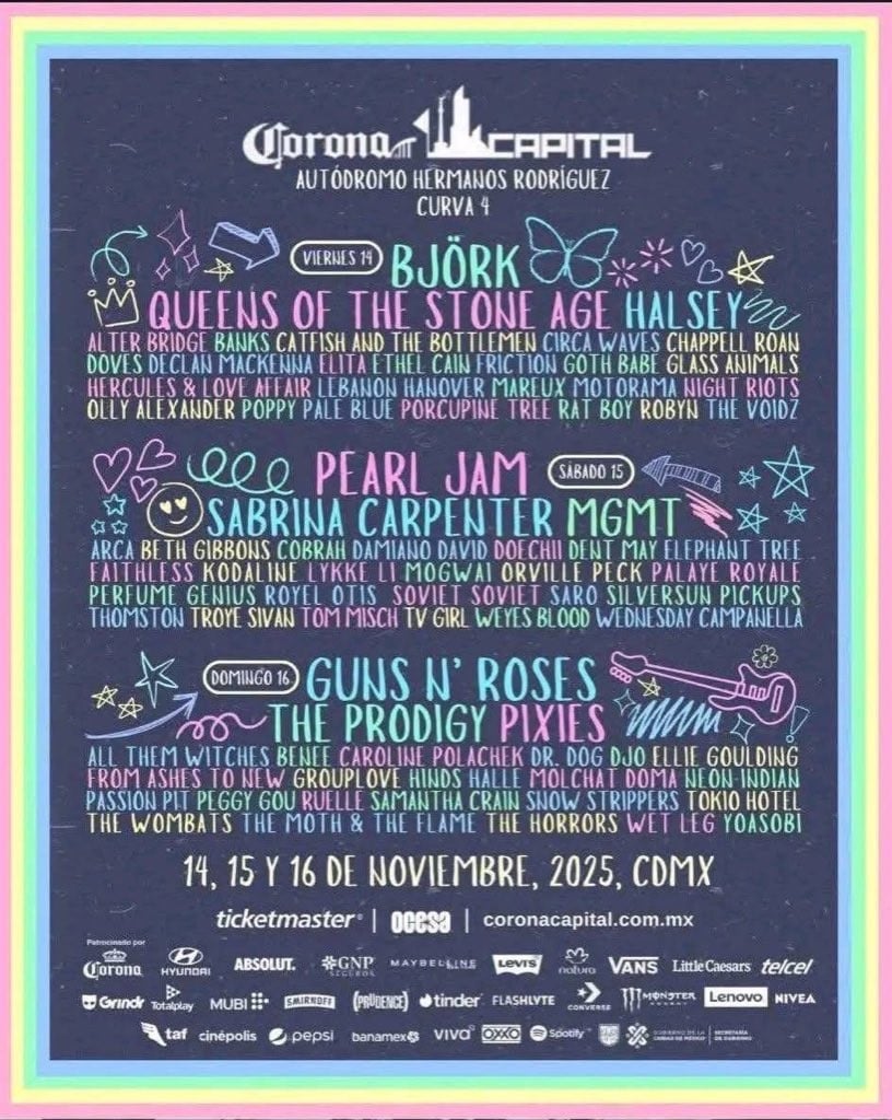 Según la imagen filtrada, el festival se llevará a cabo los días 14, 15 y 16 de noviembre de 2025. Y en el primer día presuntamente incluiría las presentaciones de: Catfish and the Bottlemen, Circa Waves, Poppy, Chappell Roan y Björk.