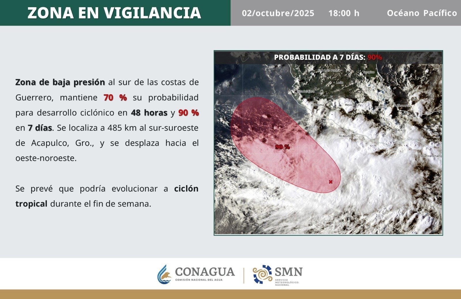 Guanajuato, Gto. – La Comisión Nacional del Agua (Conagua) y el Servicio Meteorológico Nacional (SMN) mantienen en vigilancia la zona de baja presión en el Pacífico mexicano, la cual tiene un 80 % de probabilidad de desarrollarse como el ciclón tropical Priscilla durante el fin de semana. Aunque su trayectoria principal contempla los estados costeros de Michoacán, Jalisco y Colima, sus efectos indirectos podrían sentirse en Guanajuato.