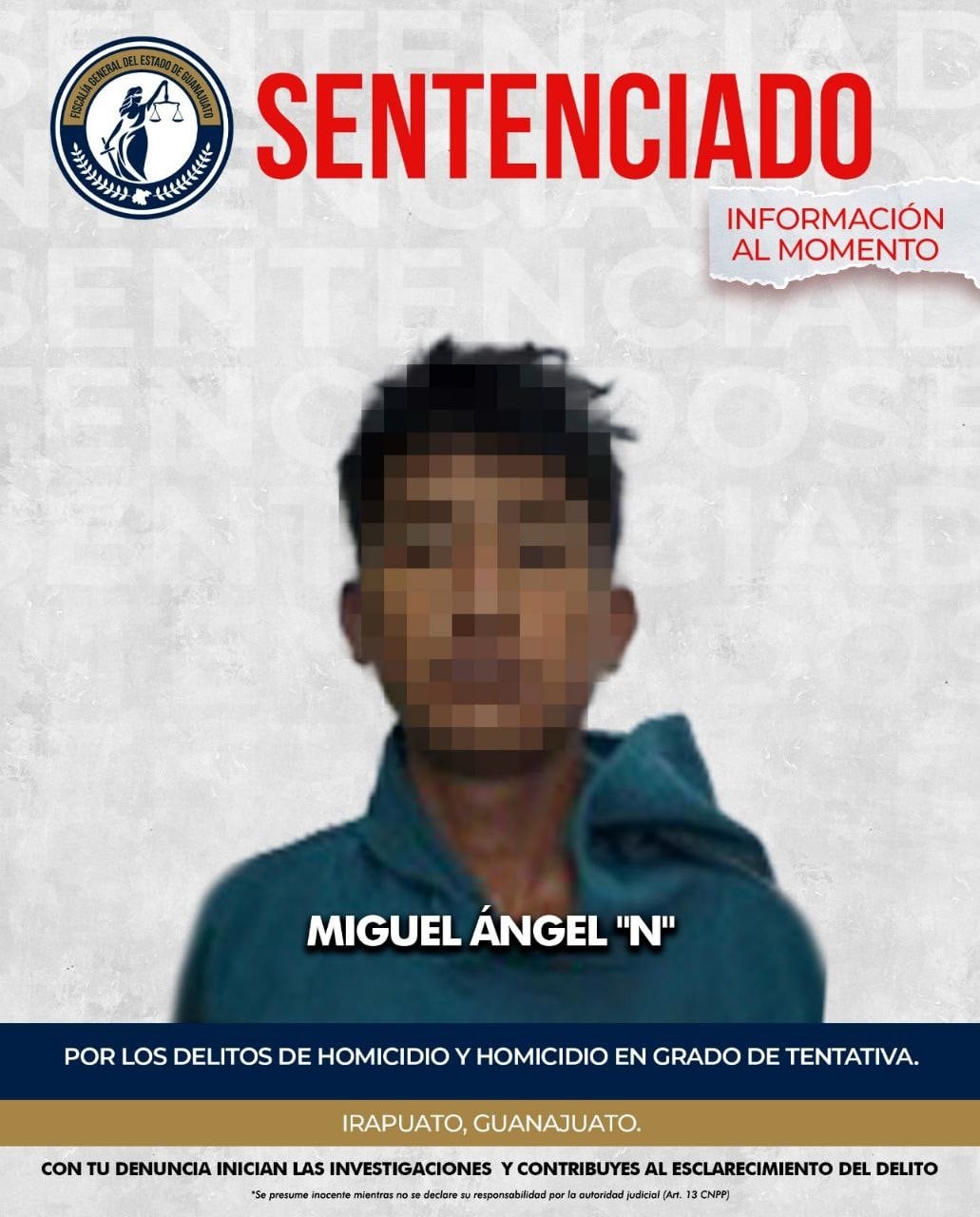 Irapuato, Gto.- La Fiscalía General del Estado de Guanajuato logró que un Juez dictara sentencia condenatoria de 22 años y 6 meses de prisión en contra de MIGUEL ÁNGEL “N”, tras acreditar su responsabilidad en los delitos de homicidio y homicidio en grado de tentativa, mediante un procedimiento abreviado. El sentenciado deberá cumplir su pena en prisión sin derecho a beneficios de ley.