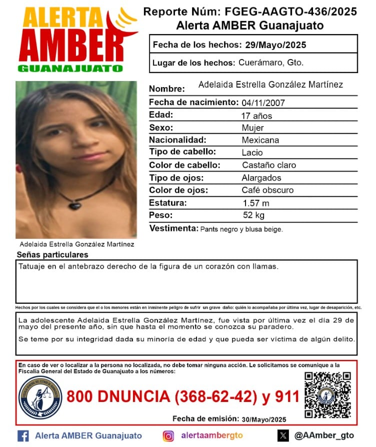 Adelaida Estrella González Martínez de 17 años fue vista por última vez el día 29 de mayo. Para identificar su familia da la siguiente descripción: cabello lacio castaño claro, ojos alargados café oscuro, mide 1.57 m y pesa 52 kg. Vestía pants negro y blusa beige.