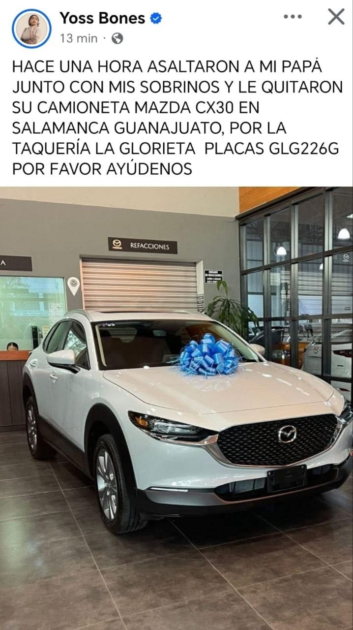 Salamanca, Guanajuato.- Comando armado despojó al papá de la cantante de Hip Hop, Yoss Bones, de una camioneta Mazda CX30, de color blanco, placas GLG226G.