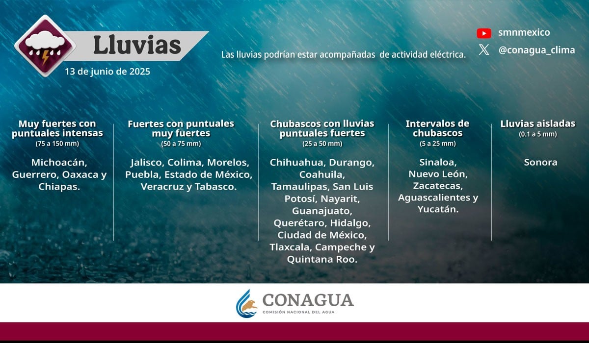 Mientras que en siete estados habrá lluvias fuertes con puntuales muy fuertes de 50 a 75 mm: