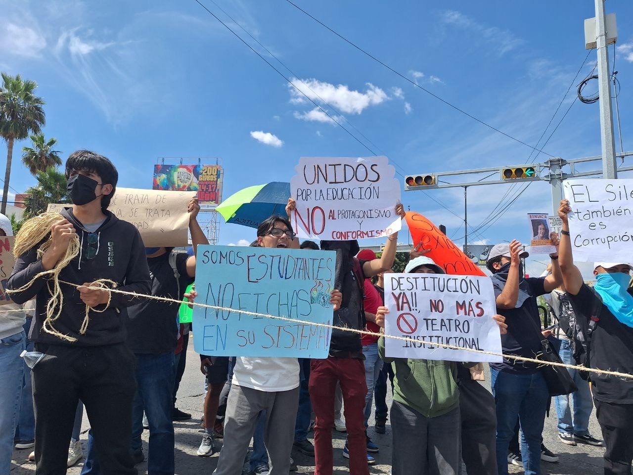 Acompañados de pancartas con consignas como “Dialogamos pero no fuimos escuchados”, “Mi educación no es tu negocio”, “Merecemos mejores aulas”, y “Somos estudiantes, no fichas en su sistema”, marcharon por las calles de la ciudad cerca de las 12:30 del medio día; avanzando hacia el bulevar Adolfo López Mateos, donde finalmente se situaron.