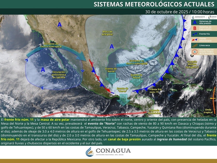 Mientras el frente frío número 11 sale del territorio nacional dejando de afectar a la entidad, este fin de semana se espera la llegada de un nuevo sistema frontal al país, el cuál podría propiciar lluvias en el noreste y oriente del país y el regreso de la baja de temperaturas.
