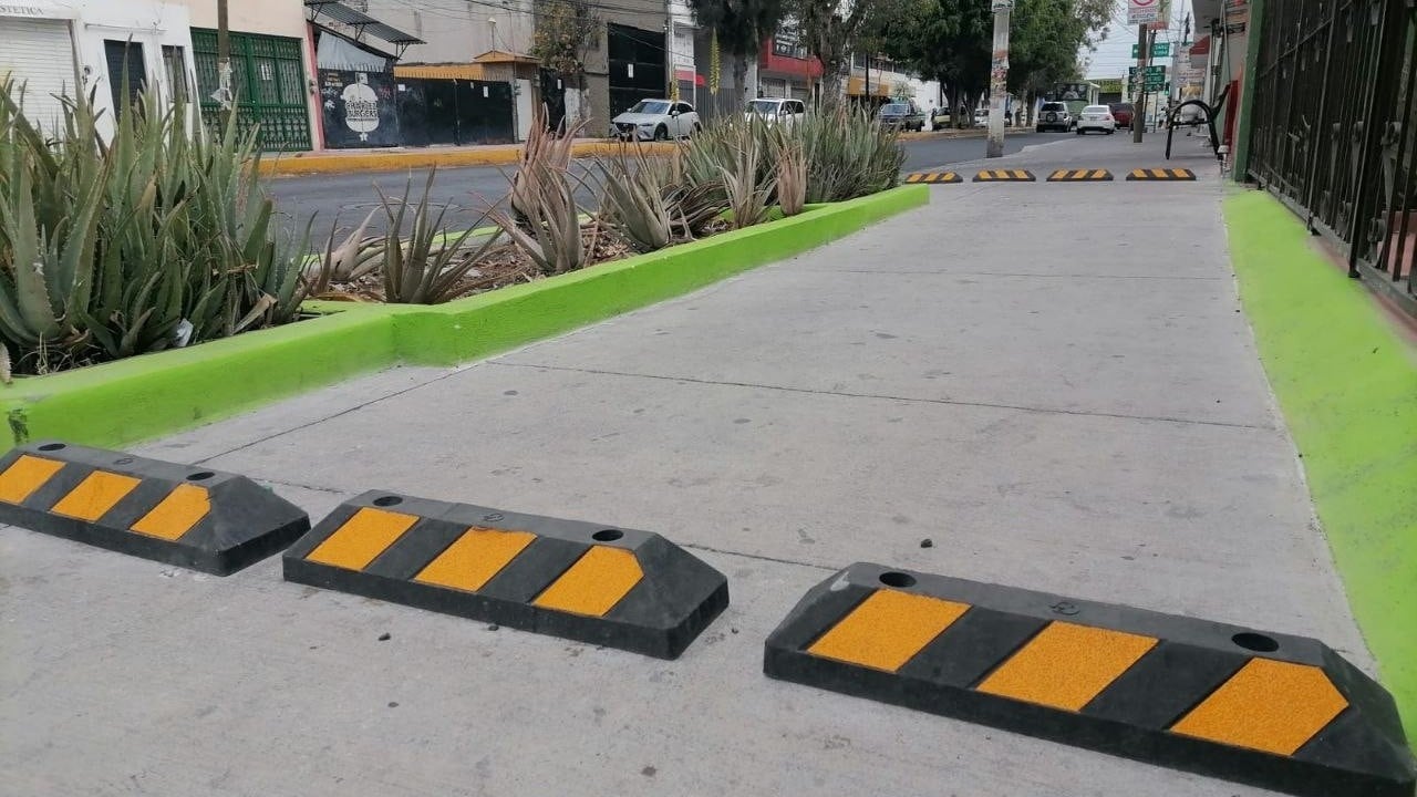 Como la banqueta no tiene guarnición y es ancha también sirve de estacionamiento, no falta el que se estaciona 5 minutos o el que incluso aprovecha para cargar o descargar en algún negocio al final la banqueta de unos 100 metros de largo se vuelve un espacio para todos menos un lugar seguro para los peatones.
