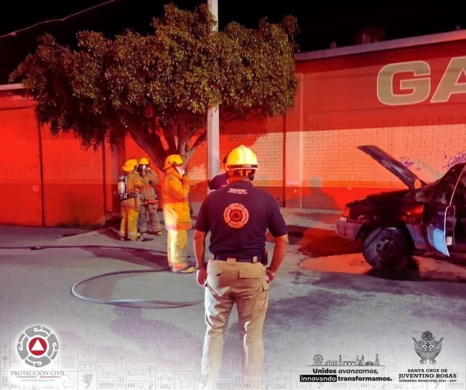 Juventino Rosas, Gto.– La noche del lunes, personal de la Unidad Municipal de Protección Civil, en coordinación con Bomberos de Juventino Rosas, sofocó un incendio registrado en un vehículo particular sobre la avenida Albino García, una de las vialidades más transitadas de la cabecera municipal.