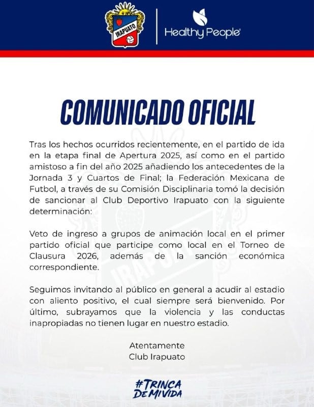 “Tras los hechos ocurridos recientemente en el partido de ida en la etapa final de apertura 2025 así como en el partido amistoso a fin del año 2025, añadiendo los antecedentes de la jornada 3 y cuartos de final la Federación Mexicana de Fútbol a través de su comisión disciplinaria tomó la decisión de sancionar al club deportivo Irapuato con la siguiente determinación: Veto de ingreso a grupos de animación local en el primer partido oficial que participe como local en el torneo de clausura 2026, además de la sanción económica correspondiente”, publicó en redes sociales el Club Deportivo Irapuato.