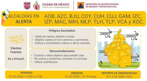 A través de un mensaje en sus redes sociales, la Secretaría de Gestión Integral de Riesgos y Protección Civil de la Ciudad de México indicó que se esperan vientos con rachas fuertes para la tarde y noche de este sábado en todas las demarcaciones de la Ciudad de México.